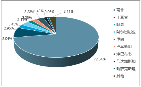 鉻為鋼灰色金屬,鉻礦常被加工成鉻鐵,90%以上用于不銹鋼的生產(chǎn)。世界鉻鐵礦資源總量超過120億噸,據(jù)美國地質(zhì)調(diào)查局的數(shù)據(jù)顯示,鉻鐵礦資源在全球分布極不均衡,主要分布在南非、哈薩克斯坦、津巴布韋、芬蘭、印度、巴西等國,其中,南非、哈薩克斯坦和津巴布韋是世界上鉻鐵礦資源最豐富的3個國家。我國鉻礦資源很大程度以來進口,南非、土耳其和津巴布韋是我國鉻礦的主要進口國,分別占2017年我國鉻礦進口數(shù)量的72.34%,8.04%和3.23%。