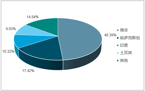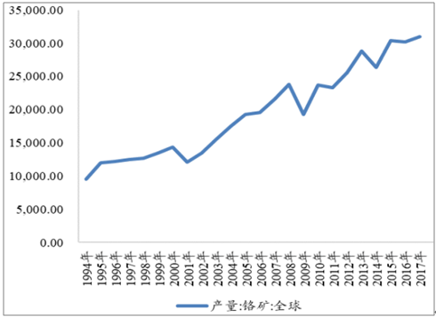 2017年全球鉻礦產(chǎn)量約為31,000.00千公噸,同比增長2.65%。其中,南非是世界上最大的鉻礦生產(chǎn)國,2017年鉻礦產(chǎn)量占全球的48.39%,哈薩克斯坦、印度、土耳其分別比17.42%,10.32%和9.03%。2017年南非鉻礦產(chǎn)量為15,000.00萬噸,同比增長2.04%。