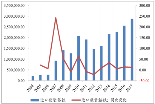 我國不銹鋼粗鋼產(chǎn)量逐年攀升,需求持續(xù)增長,我國對鉻礦需求預(yù)期將持續(xù)上升,2017年我國鉻礦進口數(shù)量達13,865,021.72噸,同比增長31.10%,鉻鐵進口數(shù)量達2,873,496.35噸,同比增加12.30%。