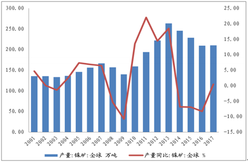 全球鎳礦產(chǎn)量(萬噸)及同比(%)
