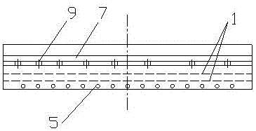 本實(shí)施例是一種不銹鋼彎頭保護(hù)氣氛熱處理導(dǎo)氣裝置,結(jié)構(gòu)如圖1-3所示,包括箱體、導(dǎo)流板以及聚氣孔,箱體由隔板4分割構(gòu)成彎管放置區(qū)1和保護(hù)氣進(jìn)氣區(qū)2,彎管放置區(qū)的空腔內(nèi)安裝測溫探頭3,保護(hù)氣進(jìn)氣區(qū)位于彎管放置區(qū)的正下方,保護(hù)氣進(jìn)氣區(qū)側(cè)面下部設(shè)有保護(hù)氣進(jìn)氣孔5,保護(hù)氣進(jìn)氣孔由多個(gè)沿箱體側(cè)面寬度方向并排設(shè)置的氣孔組成。在保護(hù)氣進(jìn)氣區(qū)內(nèi)通過導(dǎo)流板6分隔構(gòu)成往返折流的保護(hù)氣進(jìn)氣通道,保護(hù)氣進(jìn)氣通道的下端與保護(hù)氣進(jìn)氣孔相通,彎管放置區(qū)通過均勻分布在隔板上的聚氣孔9與保護(hù)氣進(jìn)氣區(qū)相通;箱體側(cè)面頂部設(shè)有放置管彎頭的開口7,保護(hù)氣進(jìn)氣孔與箱體放置管彎頭的開口設(shè)置在同側(cè),通過放置管彎頭的開口7與彎管放置區(qū)的空腔相通,彎管放置區(qū)的空腔內(nèi)支撐面上設(shè)有多根平行布置的支撐瓷管8,支撐瓷管的布置方向與鋼管彎頭的進(jìn)出方向垂直。